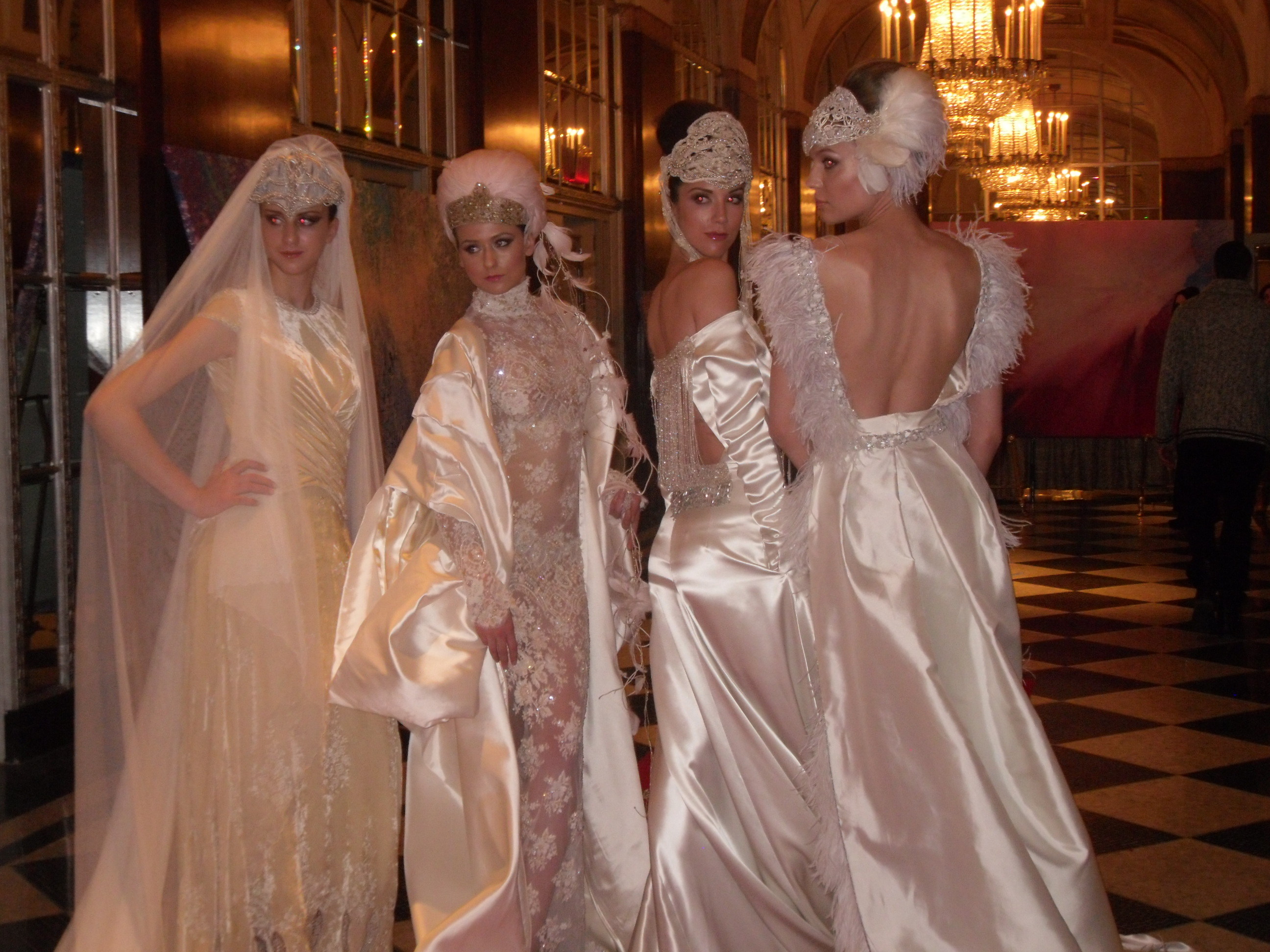 Each show features two designers and performers. In the first show, the performer did a haunting and emotion-filled rendition of “I Will Always Love You.” Then, we were presented with Collection Amoureux – Bridal Hair Couture by Elie Esper. This was a beautiful collection- most of the models wore barely there, white see through gowns with a thin line of white roses applique, straight down their front, over their breasts and rimming the bottom of their risque and skintight gowns.