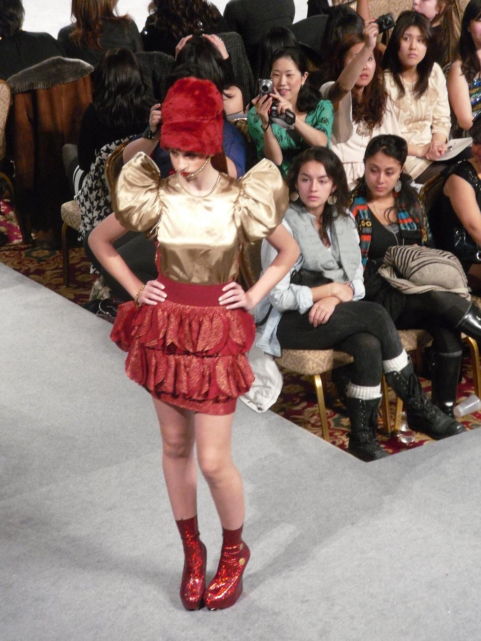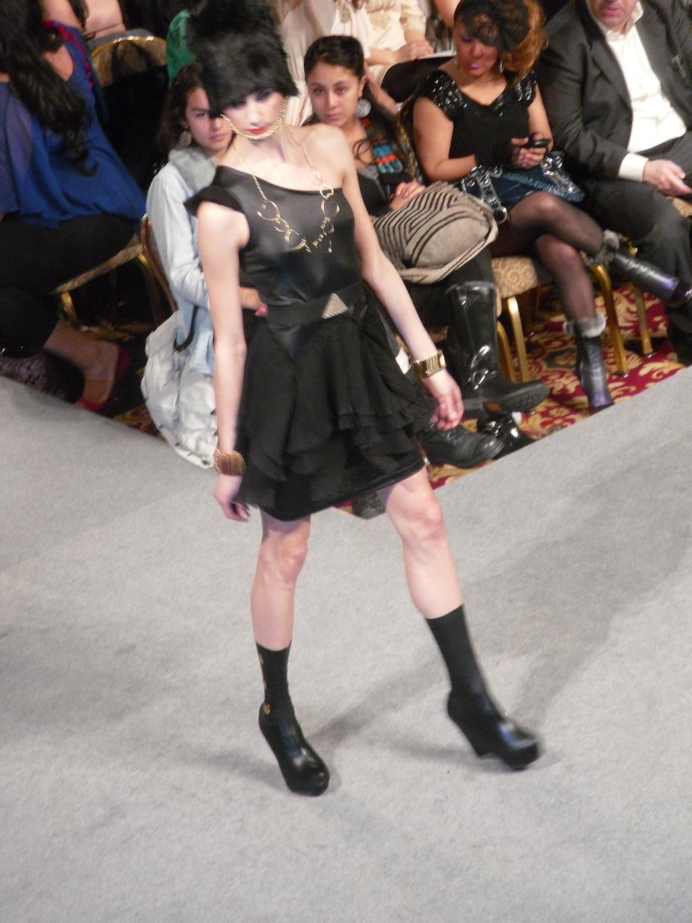 I preferred Sandra Baquero’s collection of sexy and stylish dresses. Her entire show was high energy with a London theme, complete with two guards in traditional red uniform stationed at the start of the runway. Models had on the typical fur trilby hat often worn in London and platform high heel boots. Sandra’s collection is supremely chic & charming. Even more to love about it: The average person can actually wear it, which is not common in couture fashion. Some of my favorite outfits are pictured below: