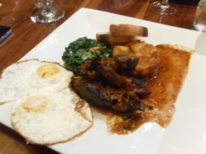 The brunch menu looked varied and delicious with great pricing: $11.95 for the meal including coffee, tea and a complimentary beverage (including alcoholic). It was a tough decision, but I finally settled on Steak & Eggs which came with home fries, creamed spinach, homemade bread, and eggs (however style we wanted). Everything was prepared beautifully. The steak was cut into smaller pieces, making it easier on us and was simply delicious, especially covered in the sauce provided. Every part of the meal was delectable on its own, as well as together.