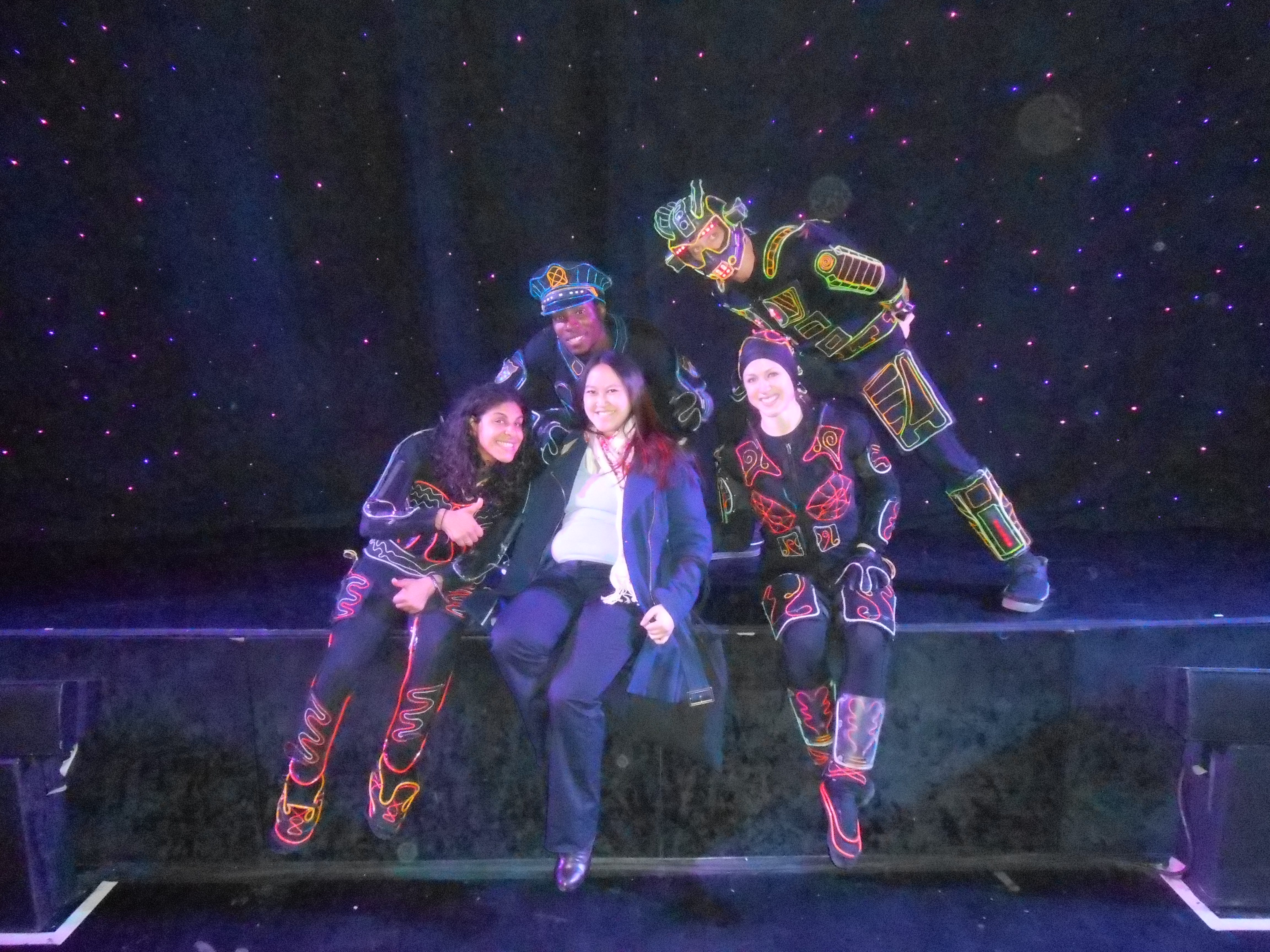 I had a chance to see the iLuminate Artist of Light Show performance, which got its beginnings on “America’s Got Talent.” It is a dance-in-the-dark adventure, with an electrifying mash-up of music, technology and illusions. It tells the story of an artist who has a magic paintbrush that brings characters to life, who inadvertently creates monsters who threaten to destroy everything he holds dear. Below, a photo of me with some of the cast members.