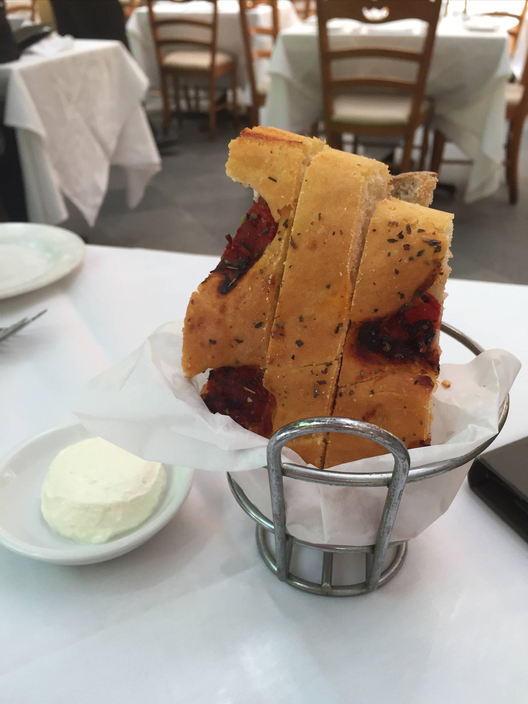 The meal started off with an assortment of breads: One sourdough with little pieces of ham in it, which was okay. I didn’t have a ton of flavor but I liked the green peas and ham that came with it. There was also muffin top bread, which was nicely moist and it came with yummy seasoned butter.