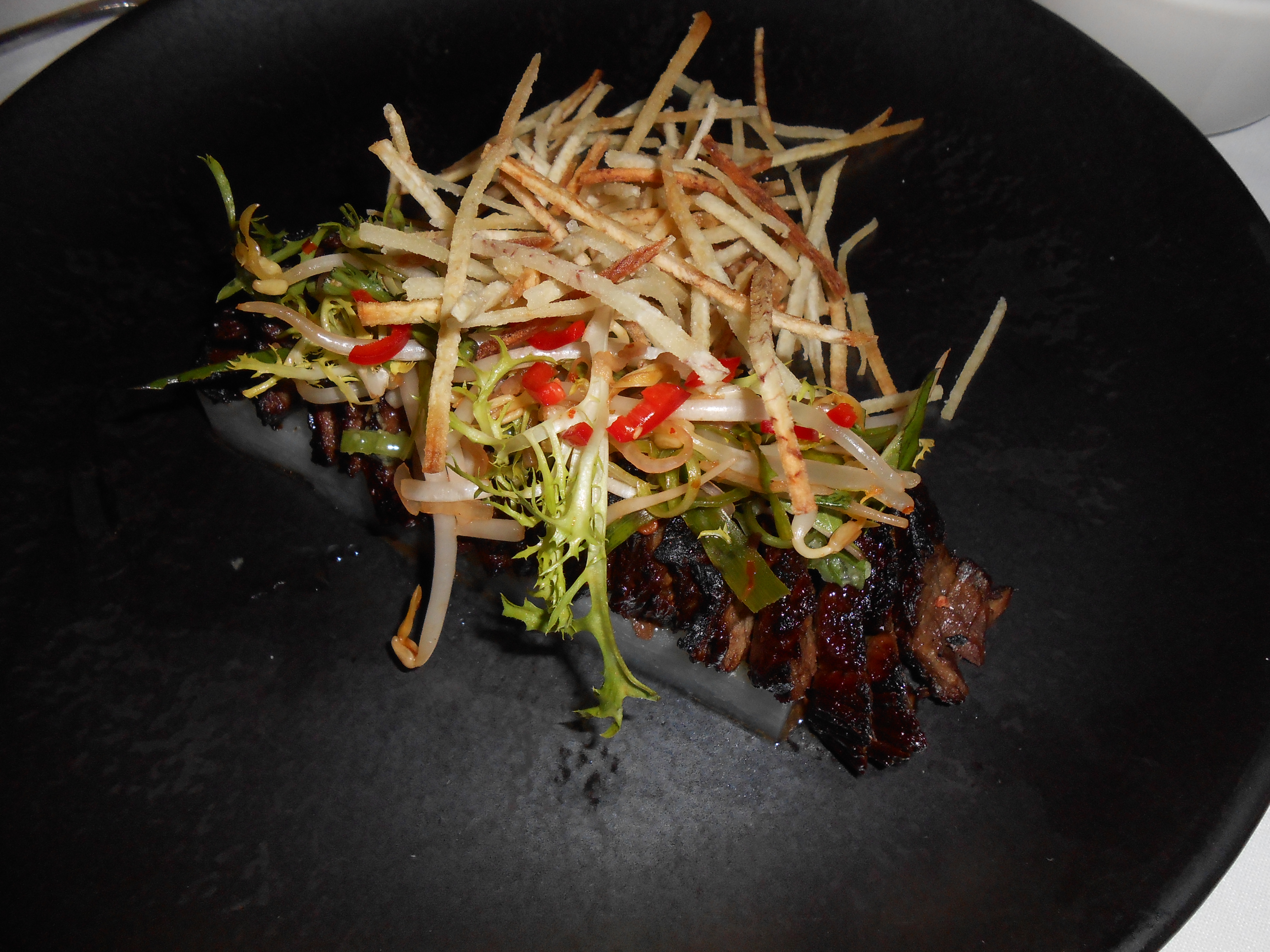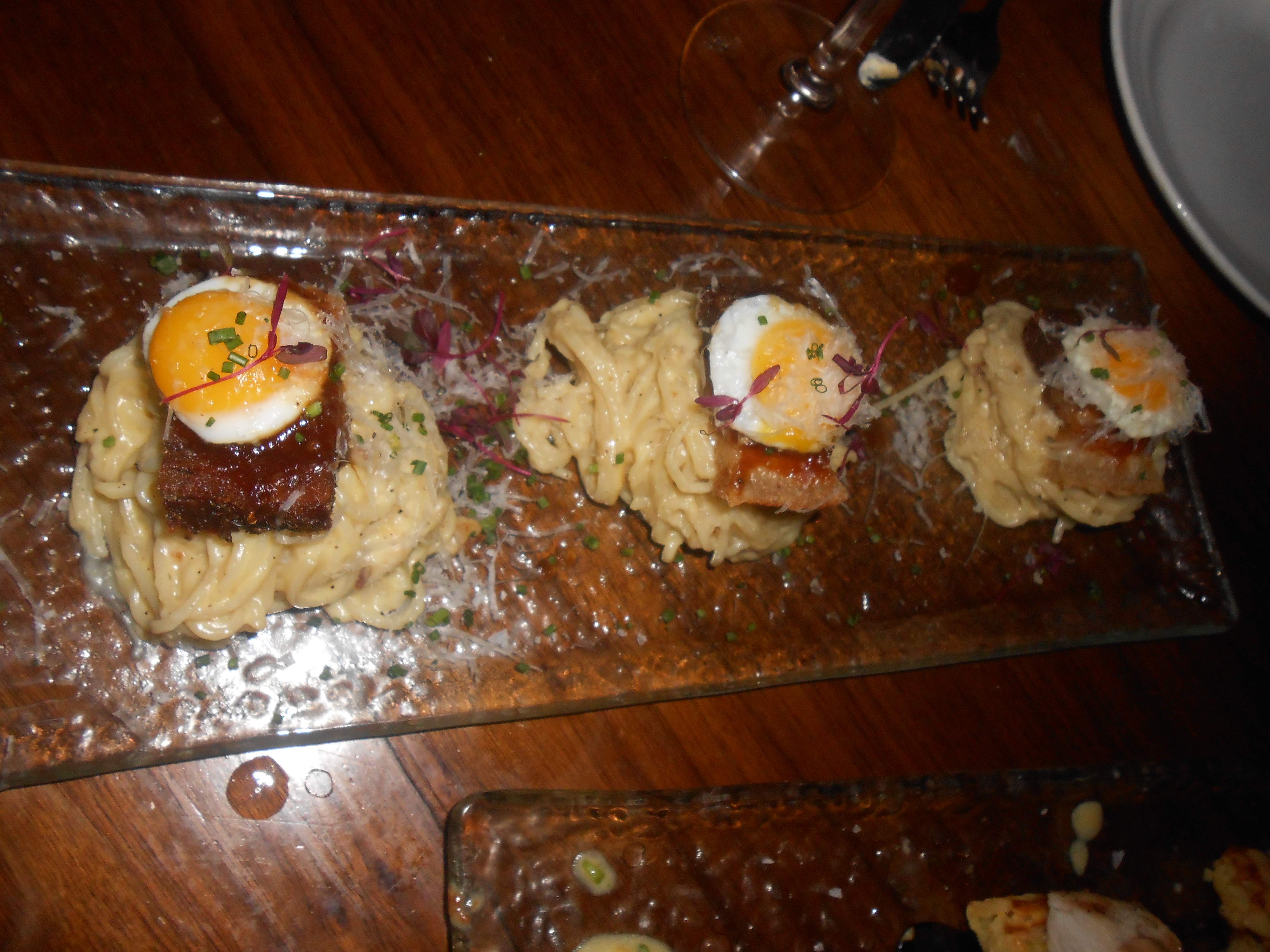 I indulged at Lower East Side restaurant hot spot, Stanton Social, getting to try many of the specialty treats, by sharing the small plates. I started off with a non-alcoholic sweet crushed strawberry drink, with a rind of orange. It tasted fruity and delicious. The strawberries at the bottom were a nice touch.
