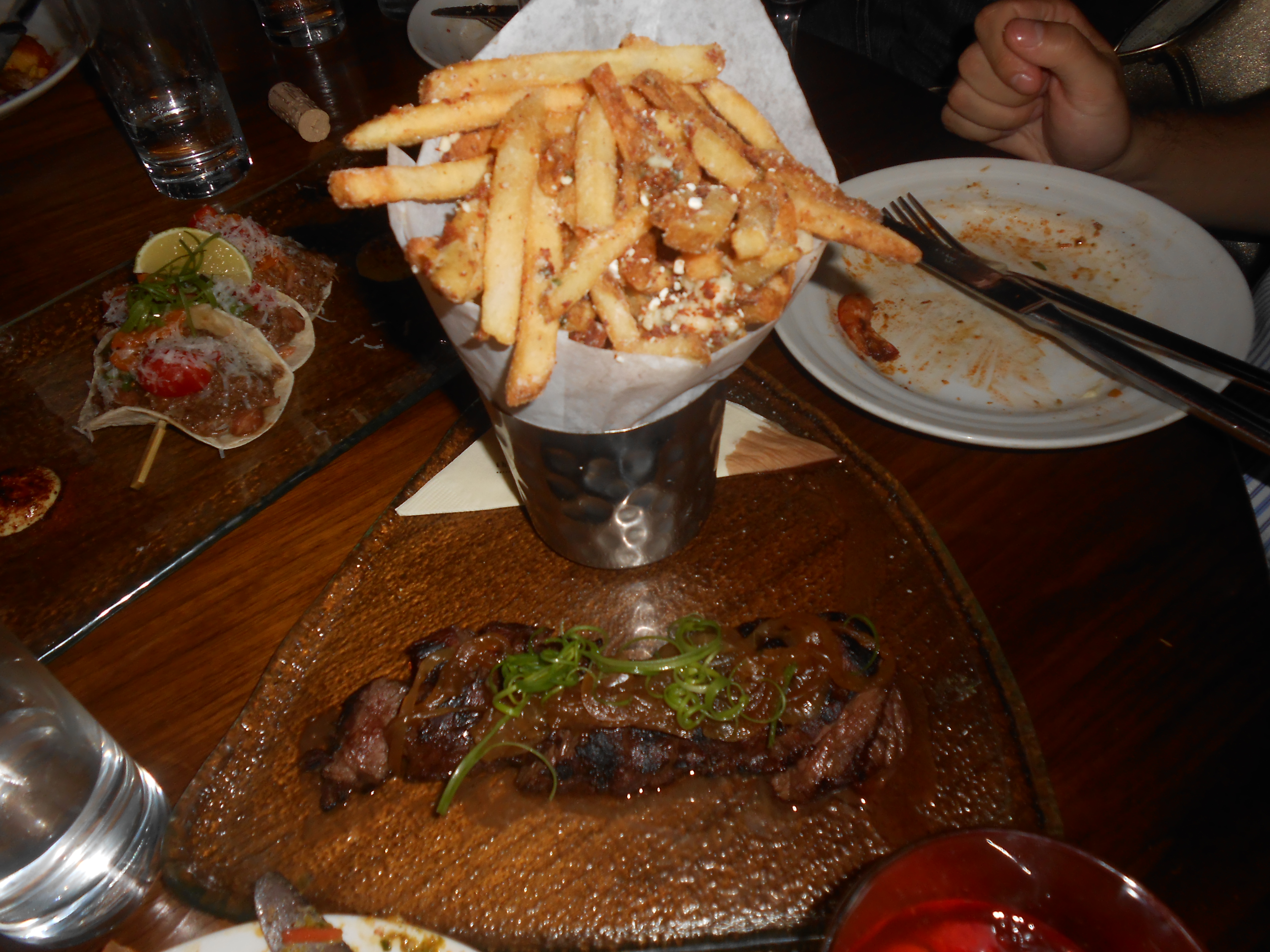 We also had hanger steak. The steak was decent: Nice and juicy, with robust flavor. I also enjoyed the french fries with crumbles of bleu-cheese and bacon, which was a bit much but still tasty, nonetheless.